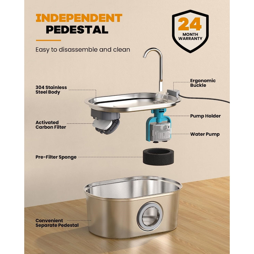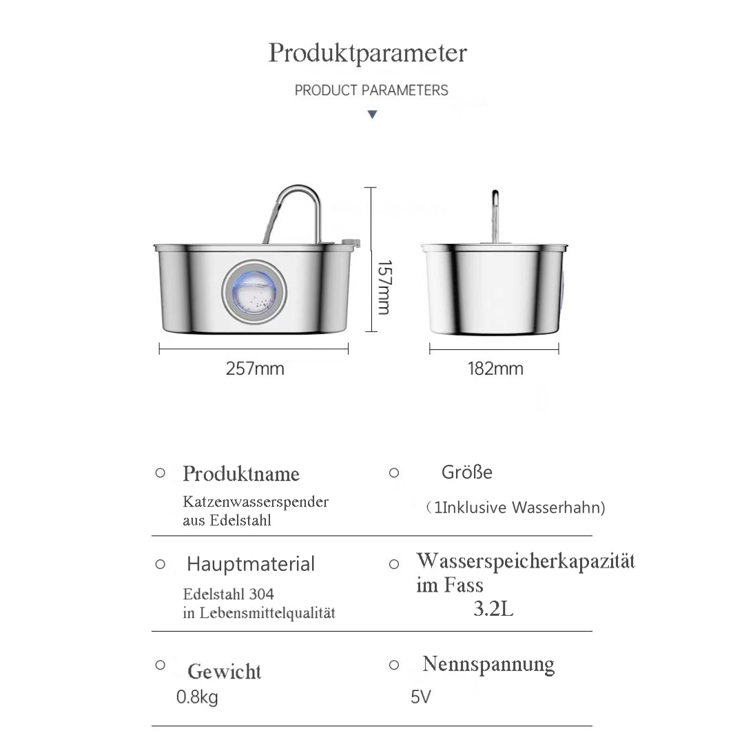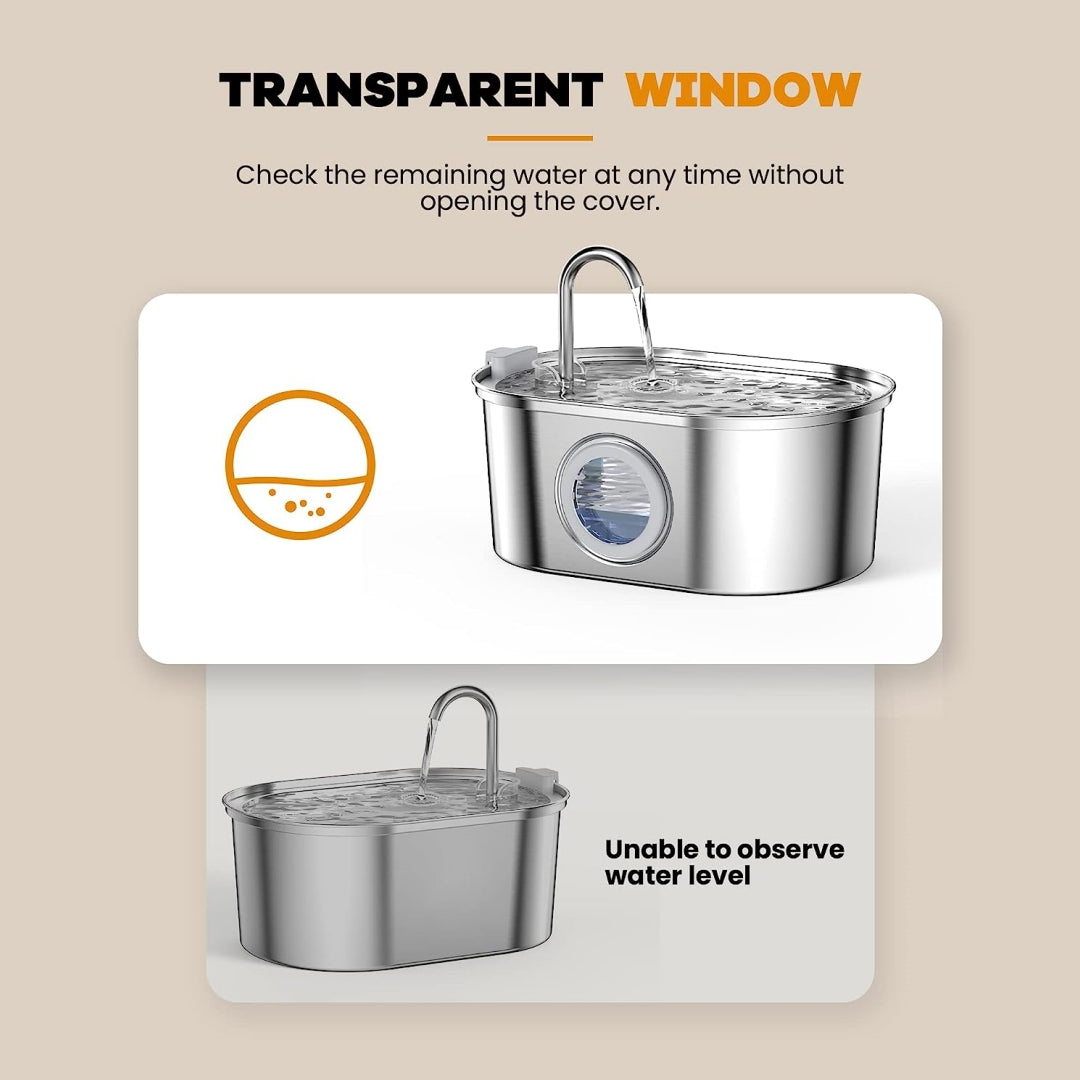 【Unique Design-Water Level Window and Stainless Steel】A transparent round window is designed on the stainless steel cat water fountain, you can see the water level of the cat water fountain without opening the cat fountain. The cat fountain is made of high quality 304 stainless steel, which is corrosion resistant.