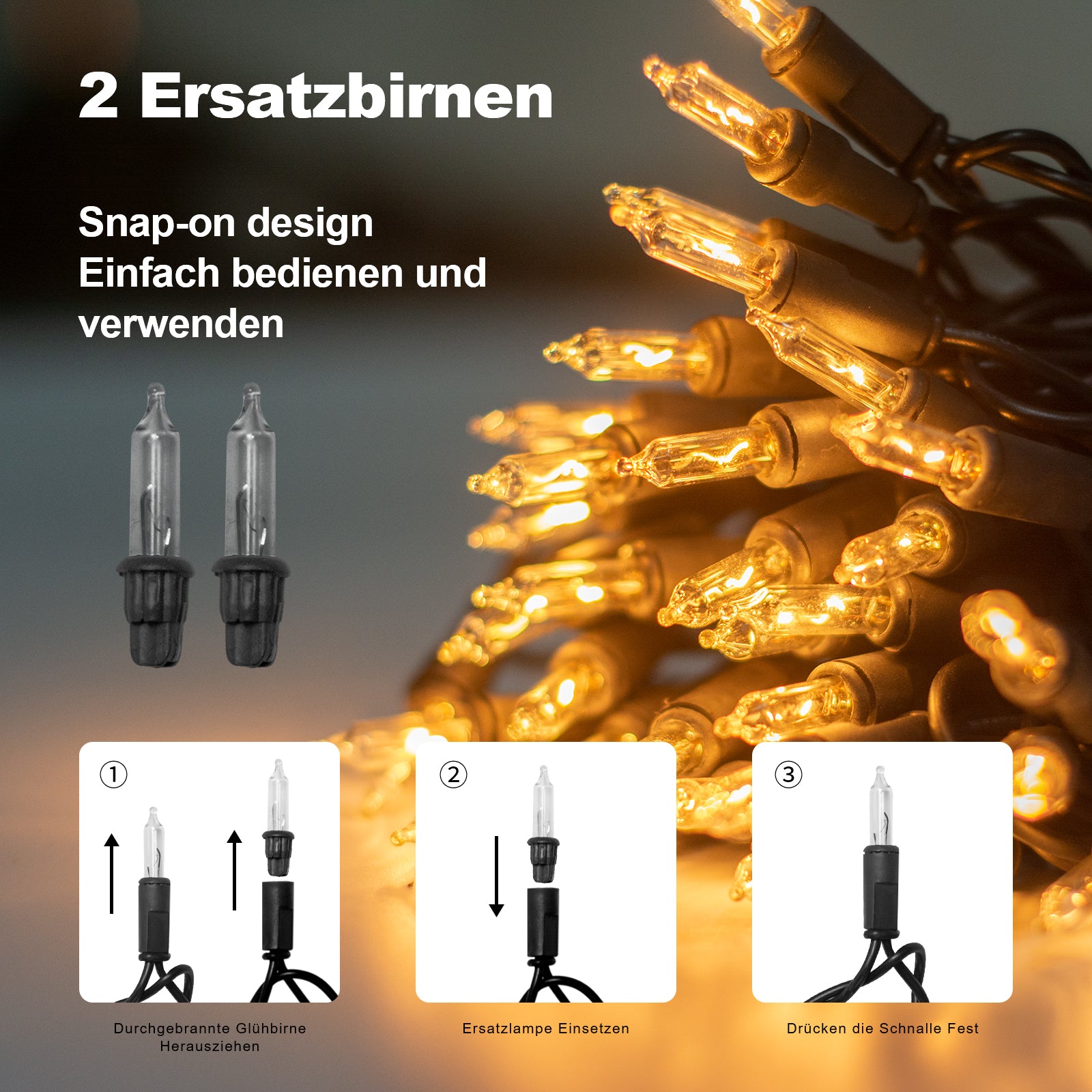 - 【Mit Schalter und Montagering】Mit dem unabhängigen Schalter lässt sich die Lichterkette innen einfach ein- und ausschalten, ohne sie jedes Mal ausstecken zu müssen. Jede Glühbirne wird mit einem verschiebbaren Befestigungsring geliefert, sodass Sie die Lichterkette einfach und ohne zusätzliches Werkzeug, mühsames Verknoten oder komplizierte Installation an Ästen befestigen können.