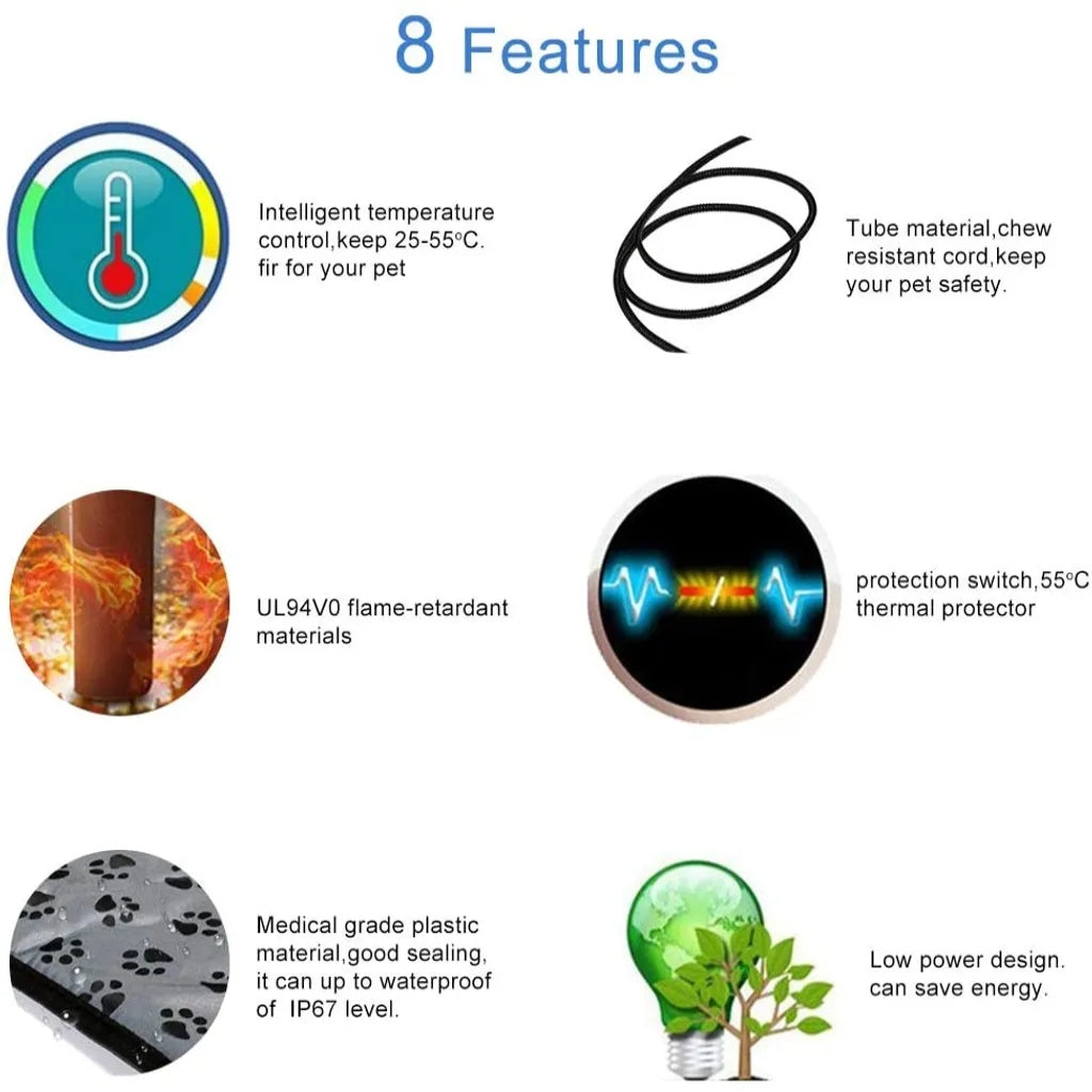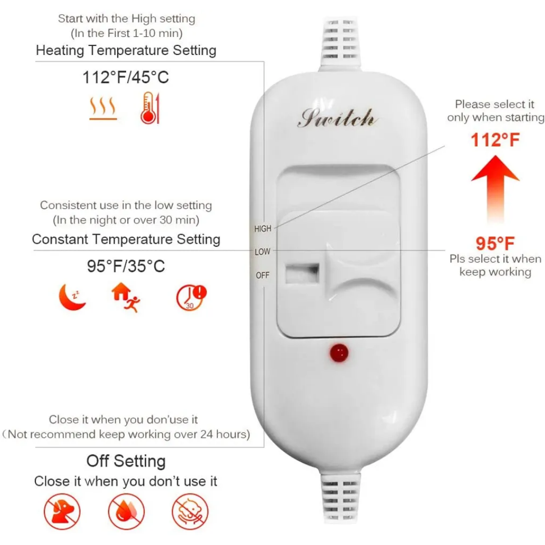 Intelligent Temperature Control: This pet electric blanket is equipped with an intelligent temperature control system. There are two temperatures to adjust. The high temperature allows the heating pad to heat up quickly in one minute. It is suitable for cold weather. The low temperature is slower and the temperature is lower. It is suitable for warmer weather.